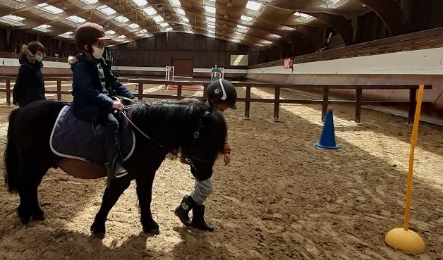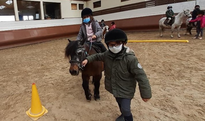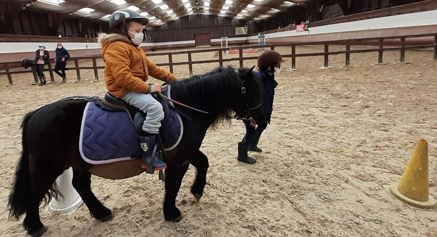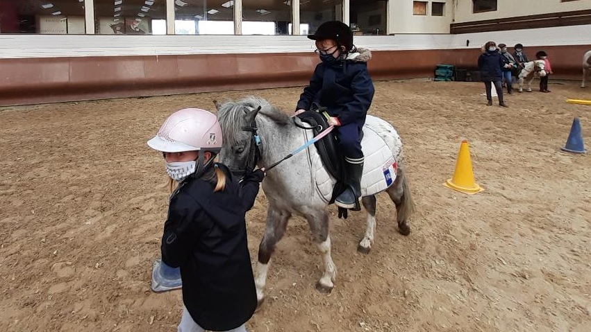 Au programme : révision du lexique autour du poney puis, slalom (diriger les rênes en étant aidé de son partenaire) et enfin trot pour la fin.