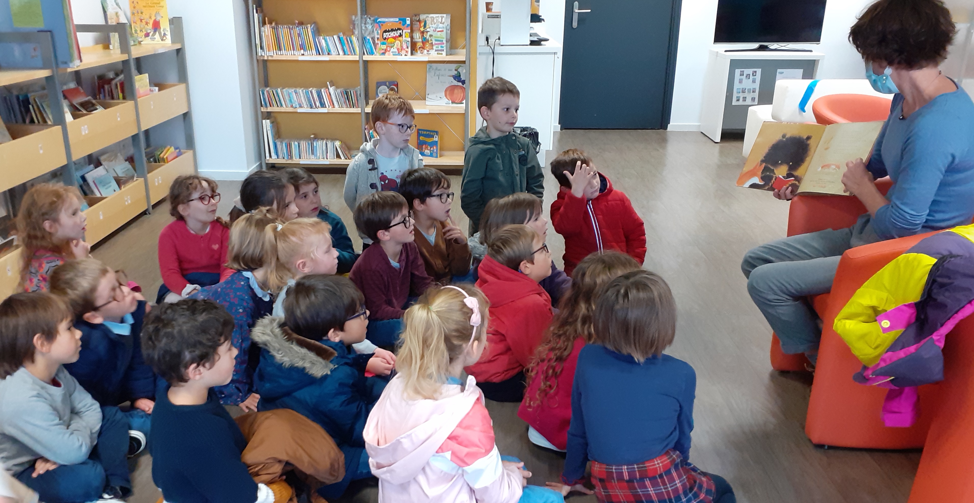 Aujourd'hui, les CP ont eu le droit à une lecture de la part de la bibliothécaire :
