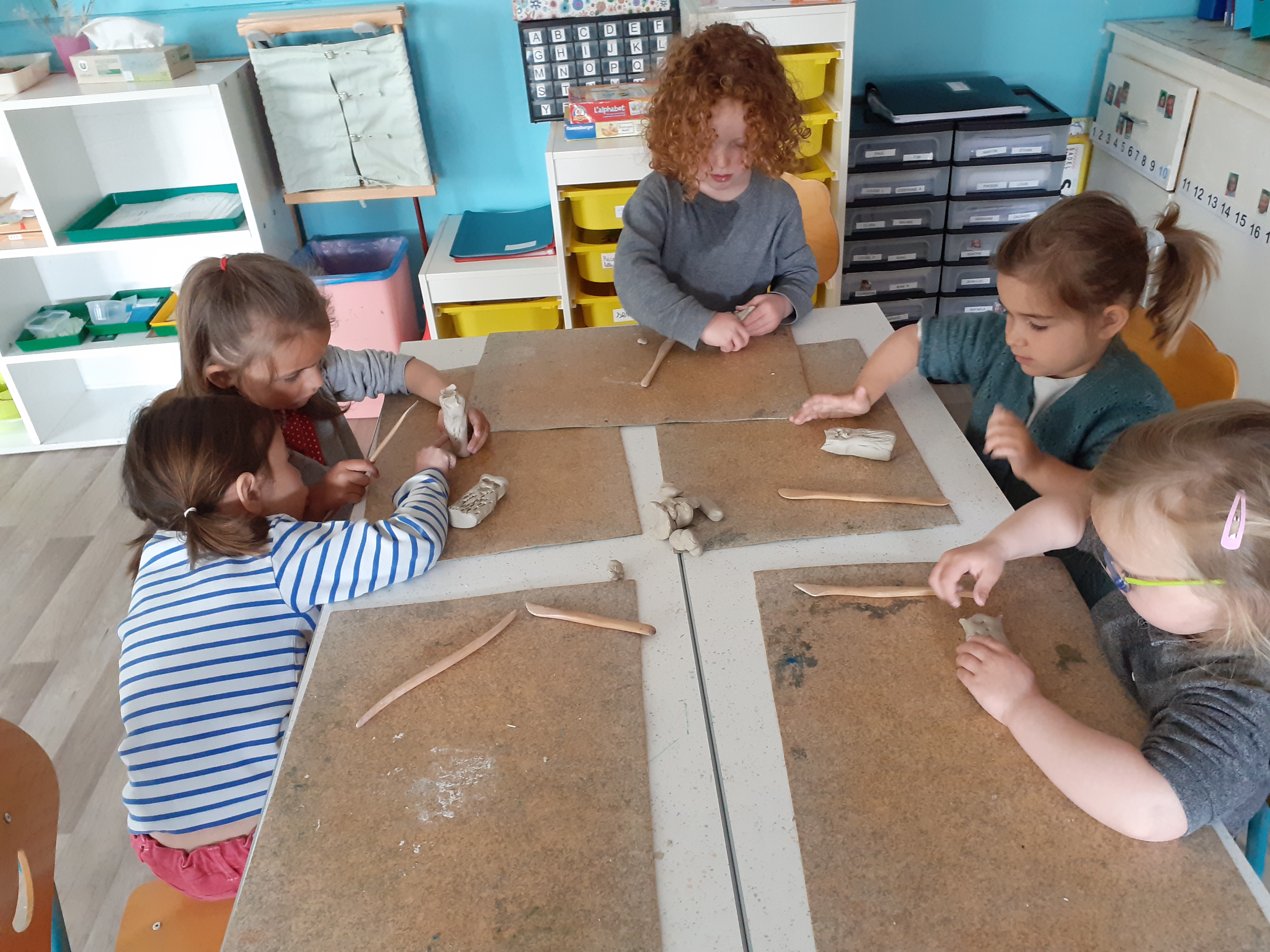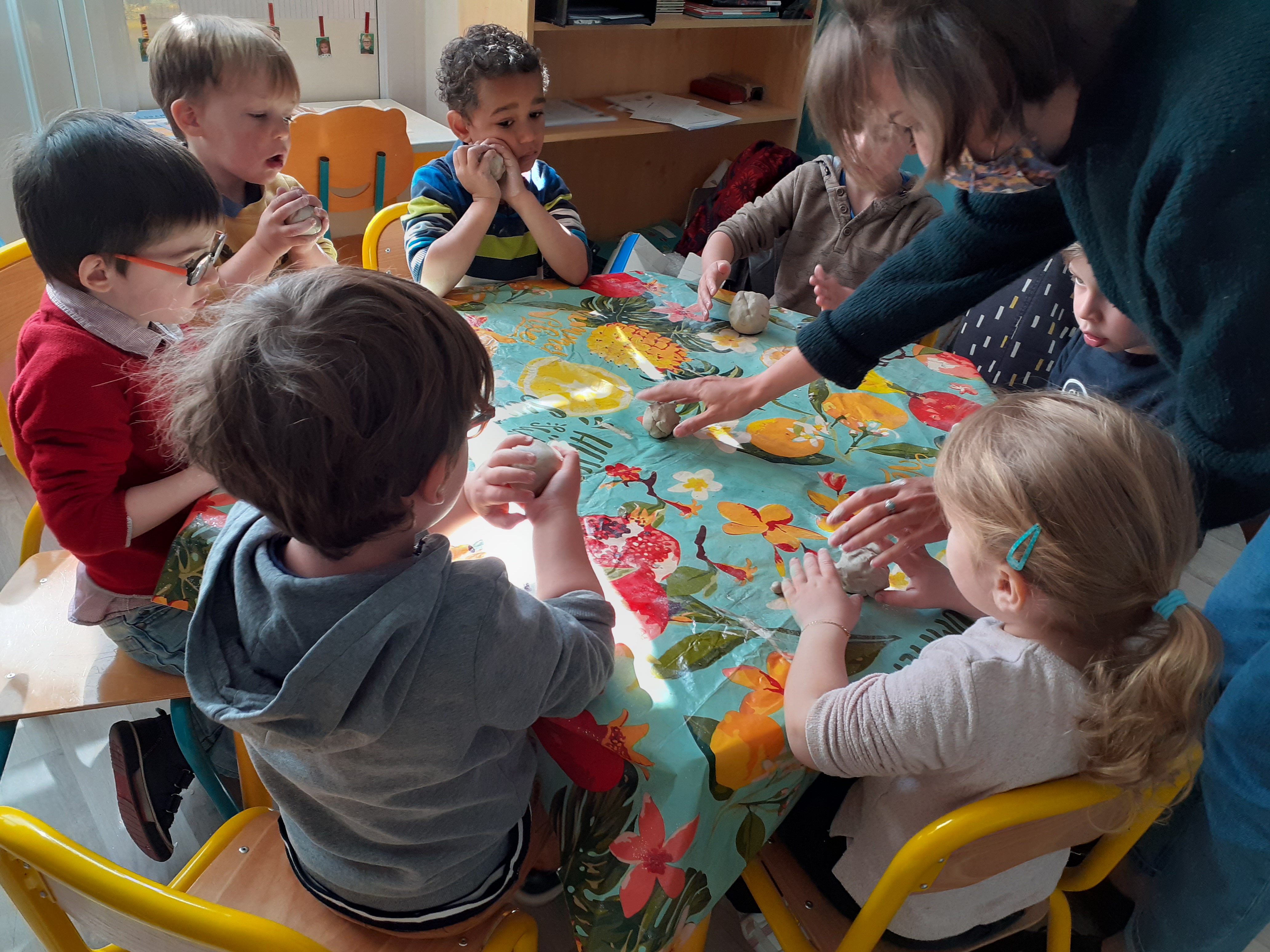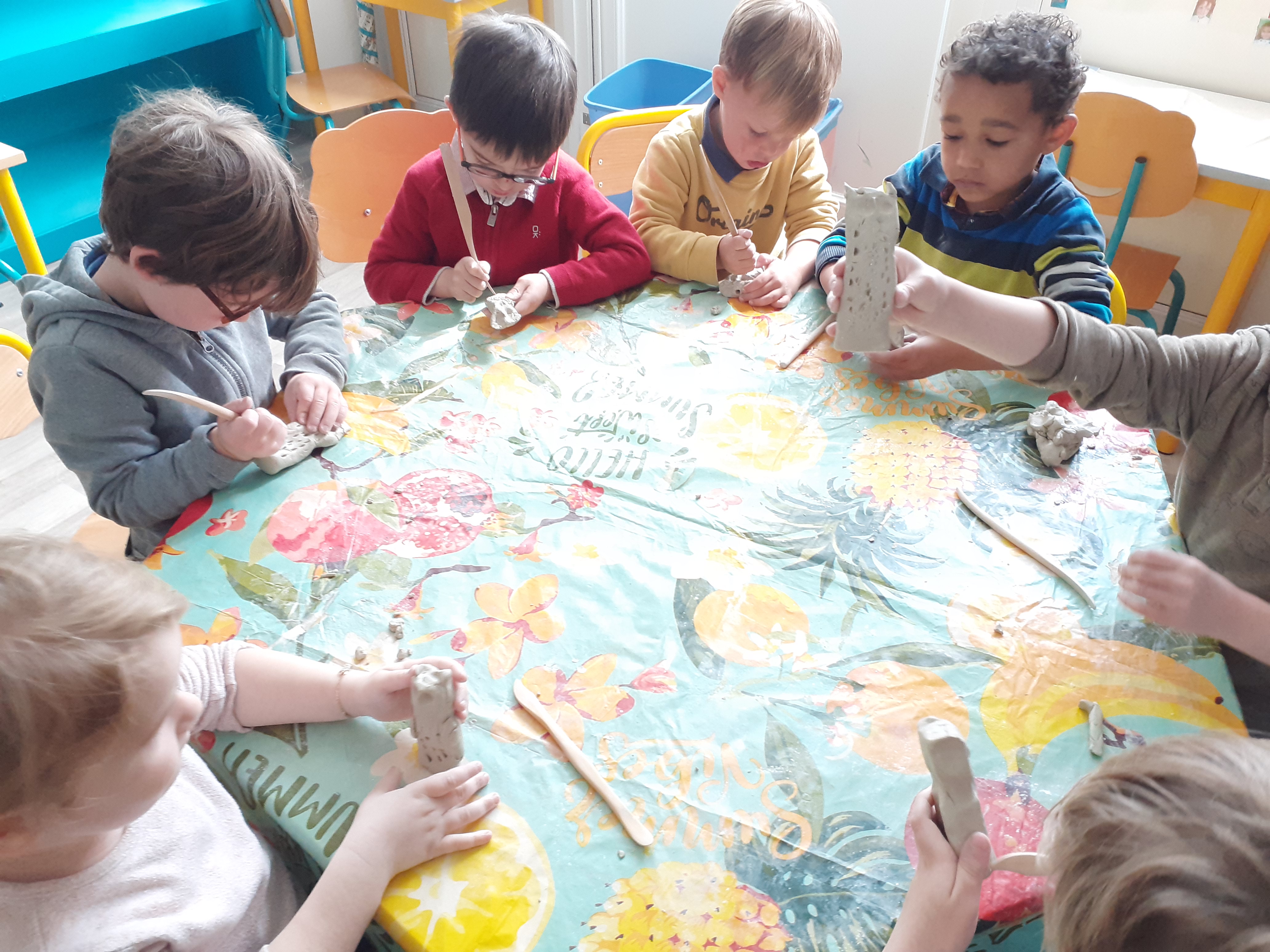 En mars, nous avons mené en classe de maternelle un cycle sur l'argile. Les enfants ont découvert cette matière et appris progressivement à la manipuler.